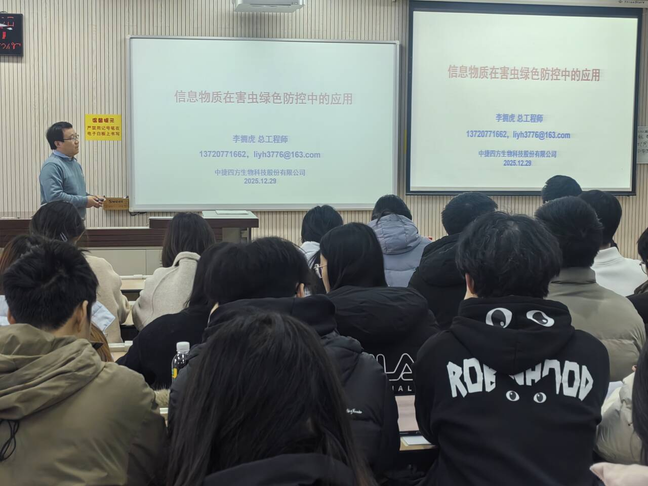 行业领航,拓宽专业视野。12月29日,成人av 邀请两家实习单位的资深专家进校作行业专题报告。上午,陕西农业发展集团有限公司的工程师郭园超分享《植物保护与农药的关联应用与案例解析》。他剖析了化学农药在农业生产中的作用,围绕农药施用的“3R”问题展开探讨,让同学们清晰认识农药产业的现状与发展方向。下午,中捷四方生物科技股份有限公司总工程师李拥虎以《信息物质在害虫绿色防控中的应用》为题,讲解昆虫信息素的作用原理,并结合产品开发与田间应用实例,展示该技术在农业绿色发展中的潜力。两位行业专家的报告内容翔实、案例生动,让同学们对实习领域有了直观且深刻的认知。